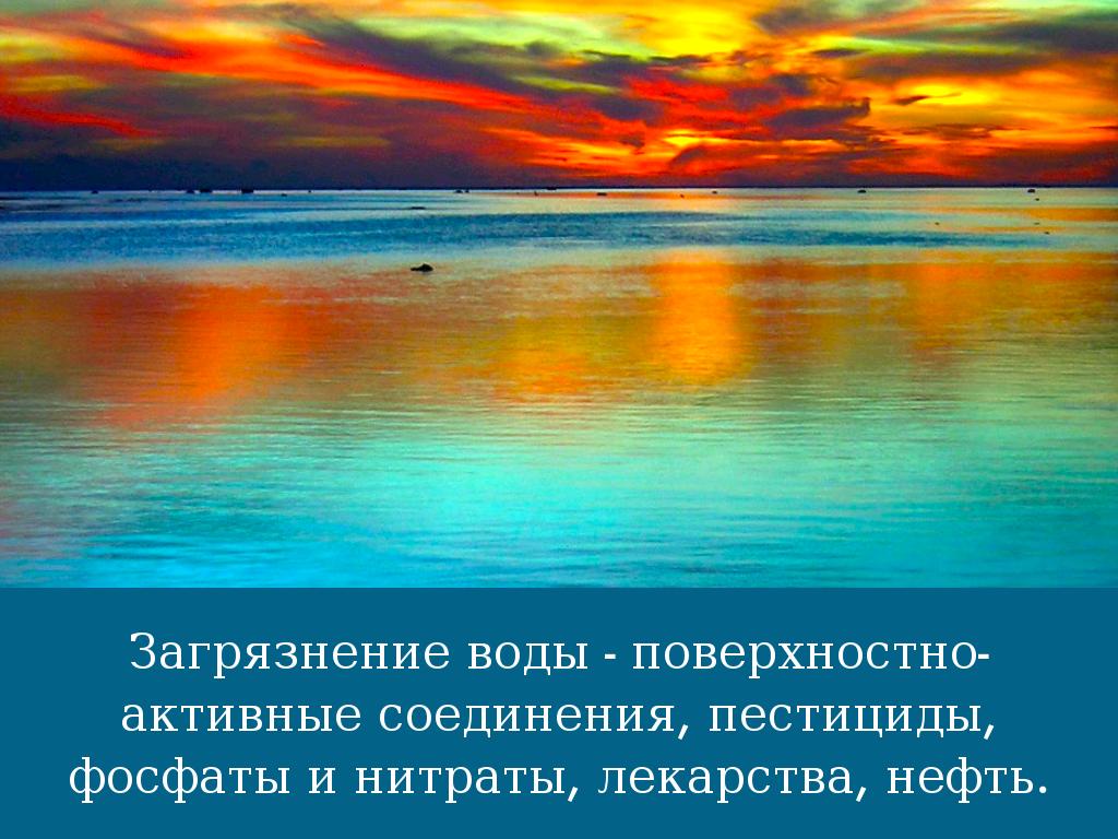 Загрязнение воды - поверхностно-активные соединения, пестициды, фосфаты и нитраты, лекарства, нефть.