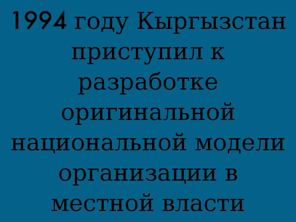 1994 году Кыргызстан приступил к разработке оригинальной национальной модели организации в местной власти