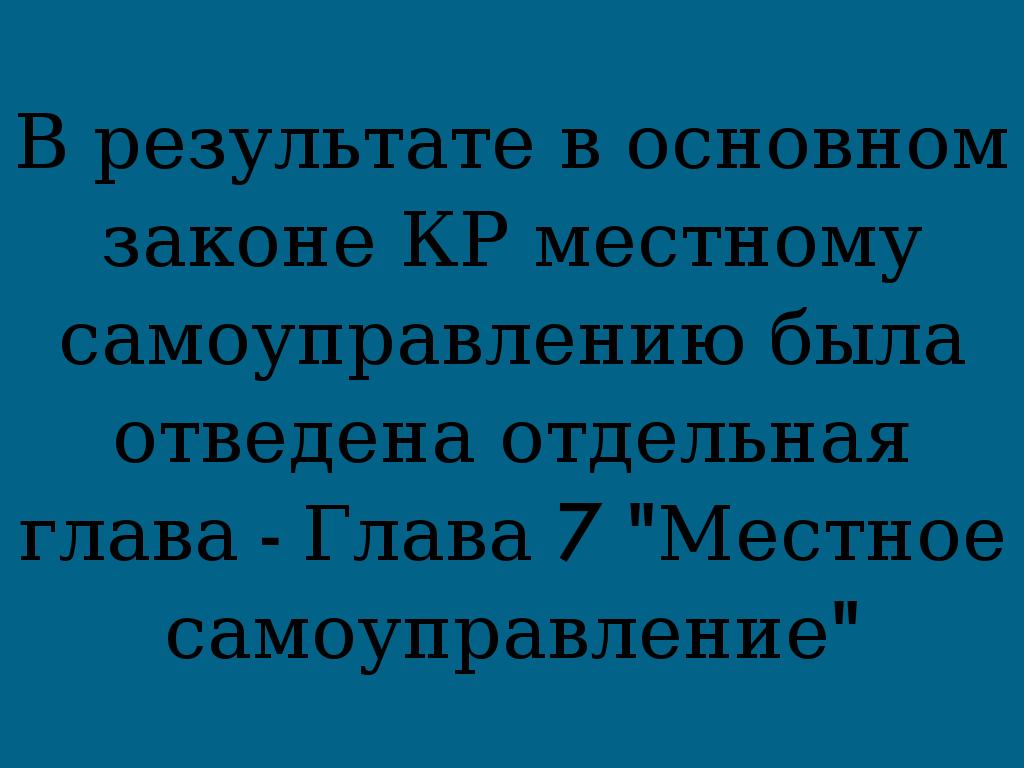В результате в основном законе КР местному самоуправлению была отведена отдельная глава - Глава 7 "Местное самоуправление"