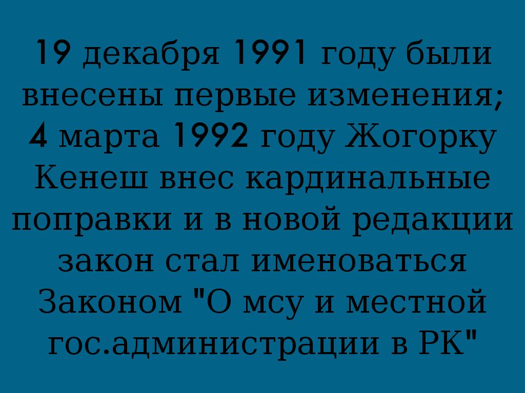 4 марта 1992 году Жогорку Кенеш внес кардинальные поправки и в новой редакции закон стал именоваться Законом "О мсу и местной гос.администрации в РК"