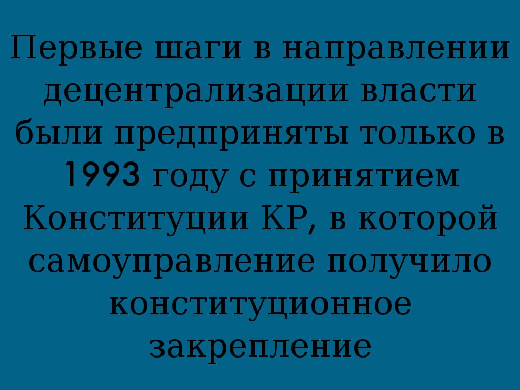 Первые шаги в направлении децентрализации власти были предприняты только в 1993 году с принятием Конституции КР, в которой самоуправление получило конституционное закрепление