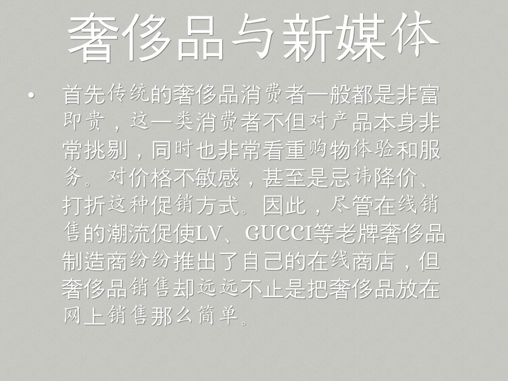 首先传统的奢侈品消费者一般都是非富即贵,这一类消费者不但对产品本身非常挑剔,同时也非常看重购物体验和服务。对价格不敏感,甚至是忌讳降价、打折这种促销方式。因此,尽管在线销售的潮流促使LV、GUCCI等老牌奢侈品制造商纷纷推出了自己的在线商店,但奢侈品销售却远远不止是把奢侈品放在网上销售那么简单。