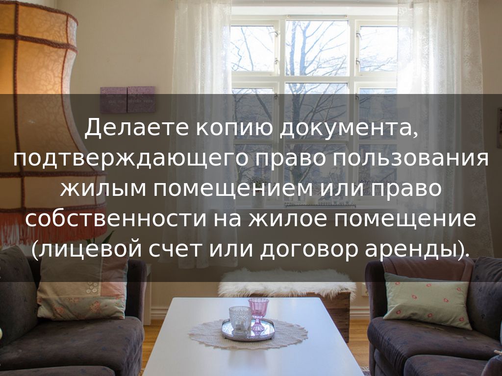 Делаете копию документа, подтверждающего право пользования жилым помещением или право собственности на жилое помещение (лицевой счет или договор аренды).