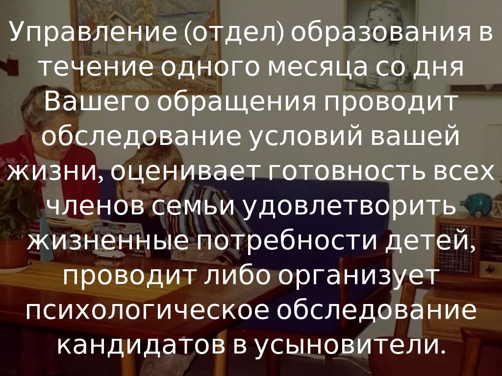 Управление (отдел) образования в течение одного месяца со дня Вашего обращения проводит обследование условий вашей жизни, оценивает готовность всех членов семьи удовлетворить жизненные потребности детей, проводит либо организует психологическое обследование кандидатов в усыновители.