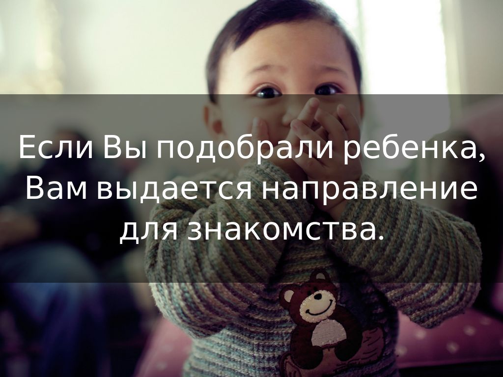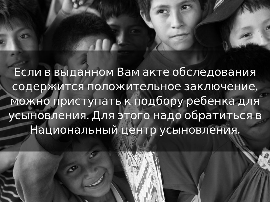 Если в выданном Вам акте обследования содержится положительное заключение, можно приступать к подбору ребенка для усыновления. Для этого надо обратиться в Национальный центр усыновления.