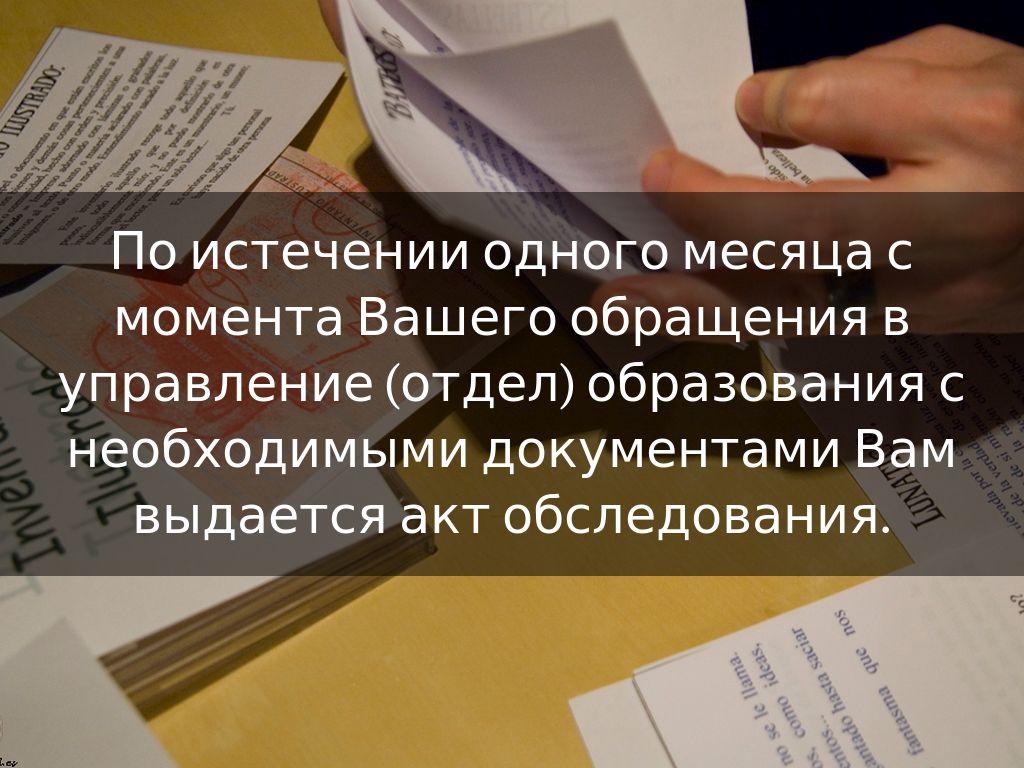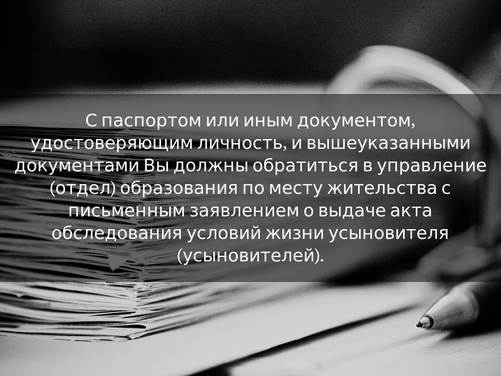 С паспортом или иным документом, удостоверяющим личность, и вышеуказанными документами Вы должны обратиться в управление (отдел) образования по месту жительства с письменным заявлением о выдаче акта обследования условий жизни усыновителя (усыновителей).
