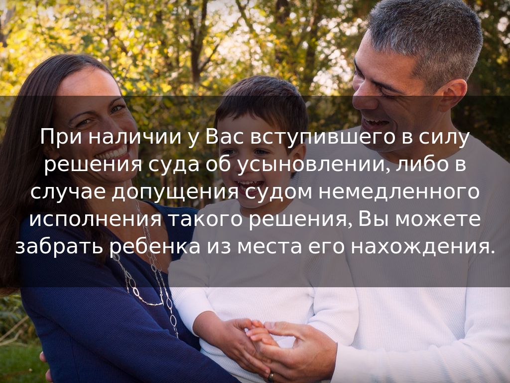 При наличии у Вас вступившего в силу решения суда об усыновлении, либо в случае допущения судом немедленного исполнения такого решения, Вы можете забрать ребенка из места его нахождения.
