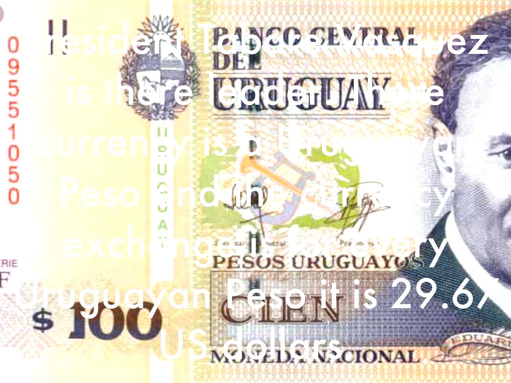 President Tabare Vasquez is there leader. There currency is a Uruguayan Peso and the currency exchange is for every Uruguayan Peso it is 29.67 US dollars.