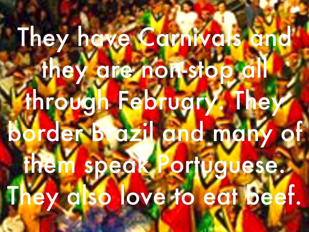 They have Carnivals and they are non-stop all through February. They border Brazil and many of them speak Portuguese. They also love to eat beef.