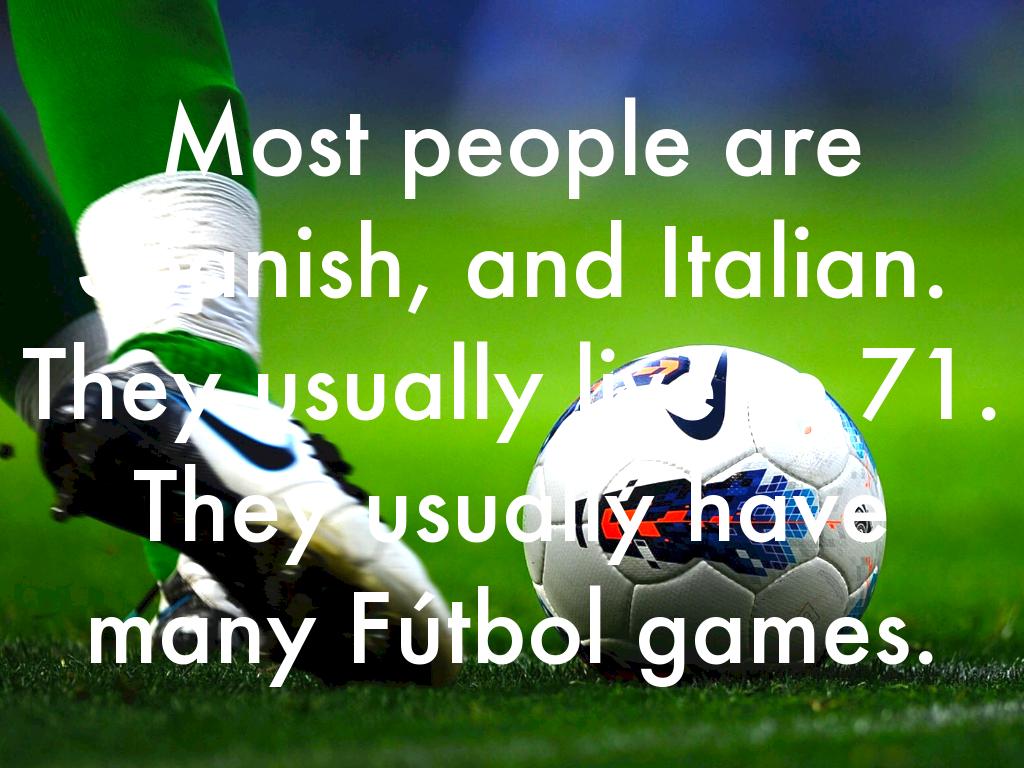 Most people are Spanish, and Italian. They usually live to 71. They usually have many Fútbol games.