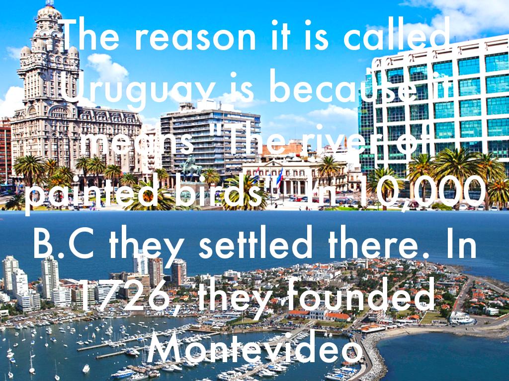 The reason it is called Uruguay is because it means "The river of painted birds". In 10,000 B.C they settled there. In 1726, they founded Montevideo