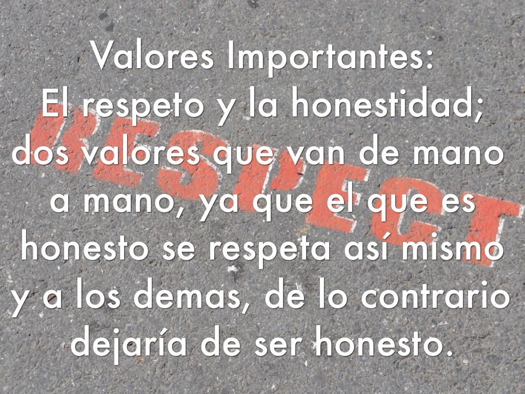 Valores Importantes: El respeto y la honestidad; dos valores que van de mano a mano, ya que el que es honesto se respeta así mismo y a los demas, de lo contrario dejaría de ser honesto.