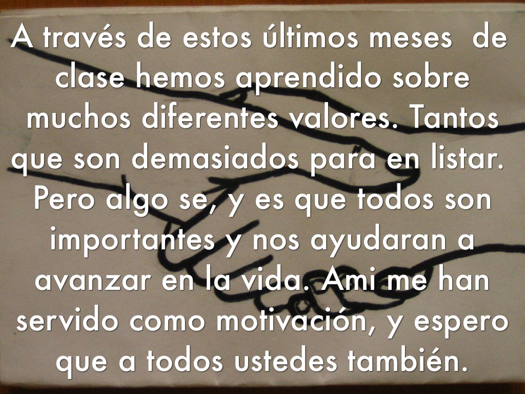 A través de estos últimos meses de clase hemos aprendido sobre muchos diferentes valores. Tantos que son demasiados para en listar. Pero algo se, y es que todos son importantes y nos ayudaran a avanzar en la vida. Ami me han servido como motivación, y espero que a todos ustedes también.