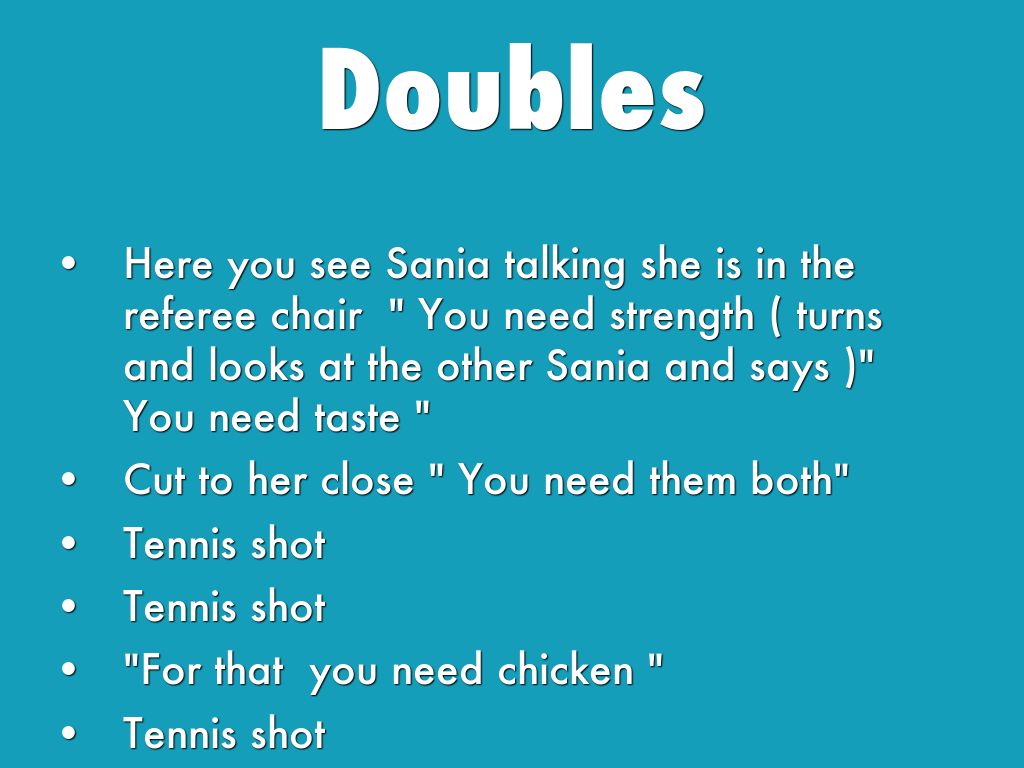 Here you see Sania talking she is in the referee chair " You need strength ( turns and looks at the other Sania and says )" You need taste "
