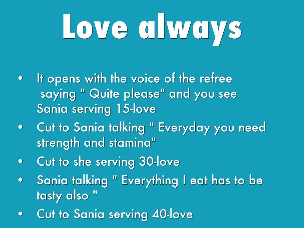It opens with the voice of the refree saying " Quite please" and you see Sania serving 15-love