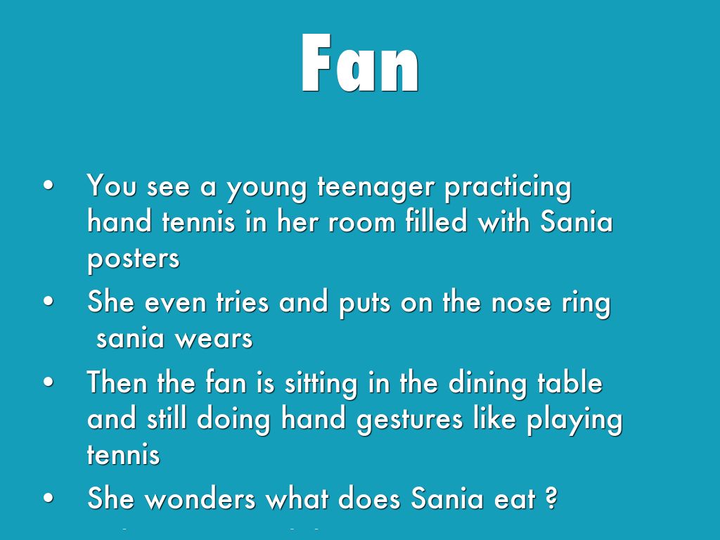 You see a young teenager practicing hand tennis in her room filled with Sania posters