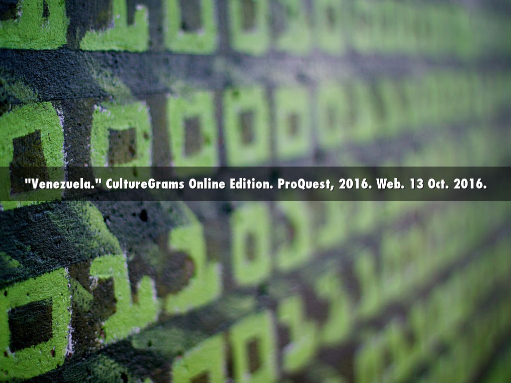 "Venezuela." CultureGrams Online Edition. ProQuest, 2016. Web. 13 Oct. 2016.