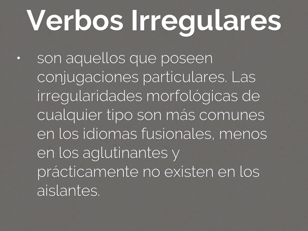son aquellos que poseen conjugaciones particulares. Las irregularidades morfológicas de cualquier tipo son más comunes en los idiomas fusionales, menos en los aglutinantes y prácticamente no existen en los aislantes.