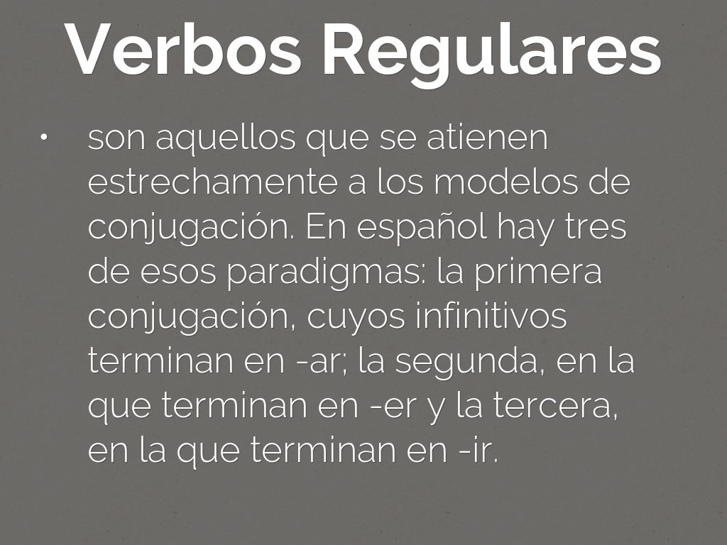 son aquellos que se atienen estrechamente a los modelos de conjugación. En español hay tres de esos paradigmas: la primera conjugación, cuyos infinitivos terminan en -ar; la segunda, en la que terminan en -er y la tercera, en la que terminan en -ir.