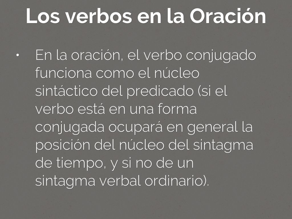 En la oración, el verbo conjugado funciona como el núcleo sintáctico del predicado (si el verbo está en una forma conjugada ocupará en general la posición del núcleo del sintagma de tiempo, y si no de un sintagma verbal ordinario).