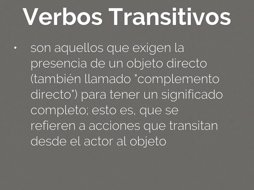 son aquellos que exigen la presencia de un objeto directo (también llamado "complemento directo") para tener un significado completo; esto es, que se refieren a acciones que transitan desde el actor al objeto