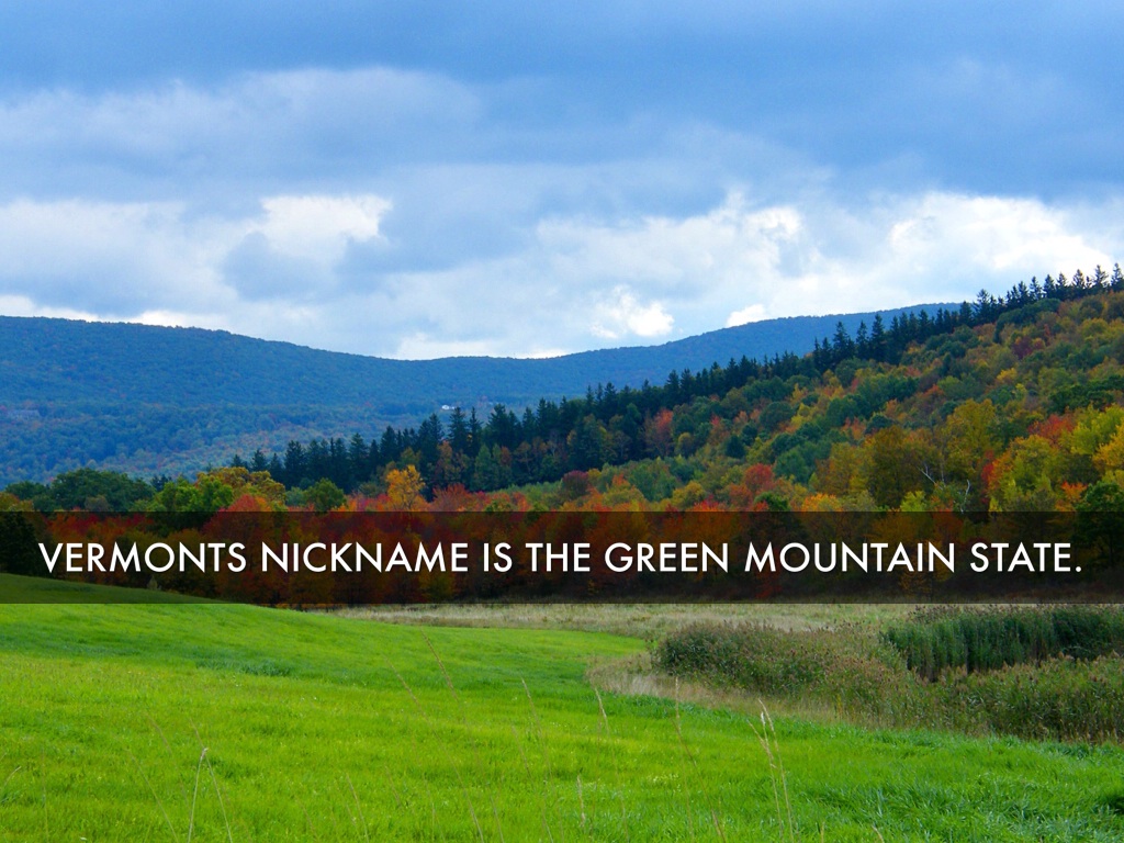 VERMONTS NICKNAME IS THE GREEN MOUNTAIN STATE.