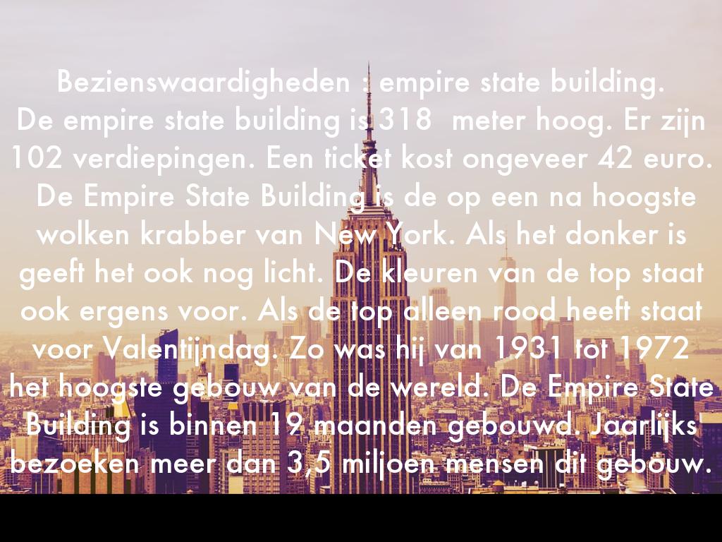 Bezienswaardigheden : empire state building. De empire state building is 318 meter hoog. Er zijn 102 verdiepingen. Een ticket kost ongeveer 42 euro. De Empire State Building is de op een na hoogste wolken krabber van New York. Als het donker is geeft het ook nog licht. De kleuren van de top staat ook ergens voor. Als de top alleen rood heeft staat voor Valentijndag. Zo was hij van 1931 tot 1972 het hoogste gebouw van de wereld. De Empire State Building is binnen 19 maanden gebouwd. Jaarlijks bezoeken meer dan 3,5 miljoen mensen dit gebouw.