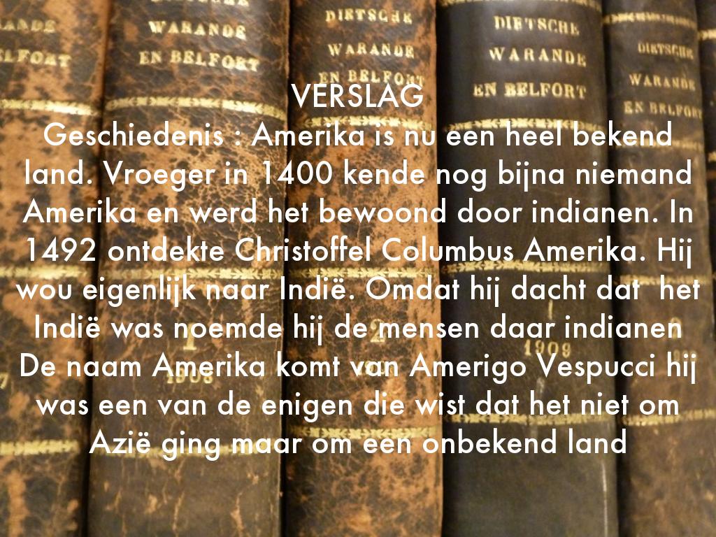 VERSLAG Geschiedenis : Amerika is nu een heel bekend land. Vroeger in 1400 kende nog bijna niemand Amerika en werd het bewoond door indianen. In 1492 ontdekte Christoffel Columbus Amerika. Hij wou eigenlijk naar Indië. Omdat hij dacht dat het Indië was noemde hij de mensen daar indianen De naam Amerika komt van Amerigo Vespucci hij was een van de enigen die wist dat het niet om Azië ging maar om een onbekend land
