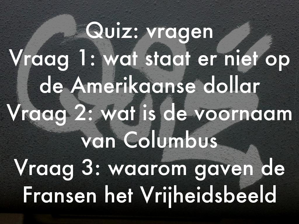 Quiz: vragen Vraag 1: wat staat er niet op de Amerikaanse dollar Vraag 2: wat is de voornaam van Columbus Vraag 3: waarom gaven de Fransen het Vrijheidsbeeld