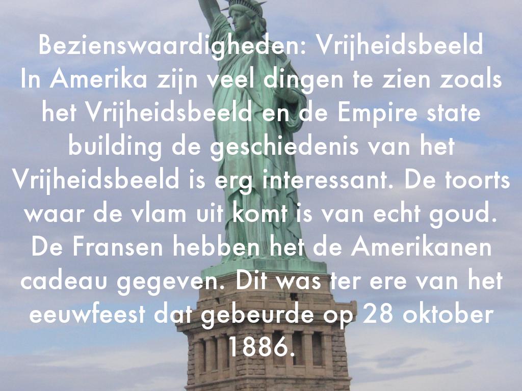 Bezienswaardigheden: Vrijheidsbeeld In Amerika zijn veel dingen te zien zoals het Vrijheidsbeeld en de Empire state building de geschiedenis van het Vrijheidsbeeld is erg interessant. De toorts waar de vlam uit komt is van echt goud. De Fransen hebben het de Amerikanen cadeau gegeven. Dit was ter ere van het eeuwfeest dat gebeurde op 28 oktober 1886.