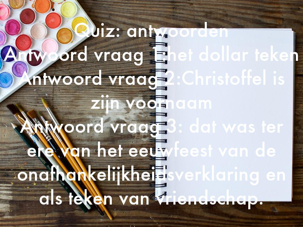 Quiz: antwoorden Antwoord vraag 1:het dollar teken Antwoord vraag 2:Christoffel is zijn voornaam Antwoord vraag 3: dat was ter ere van het eeuwfeest van de onafhankelijkheidsverklaring en als teken van vriendschap.