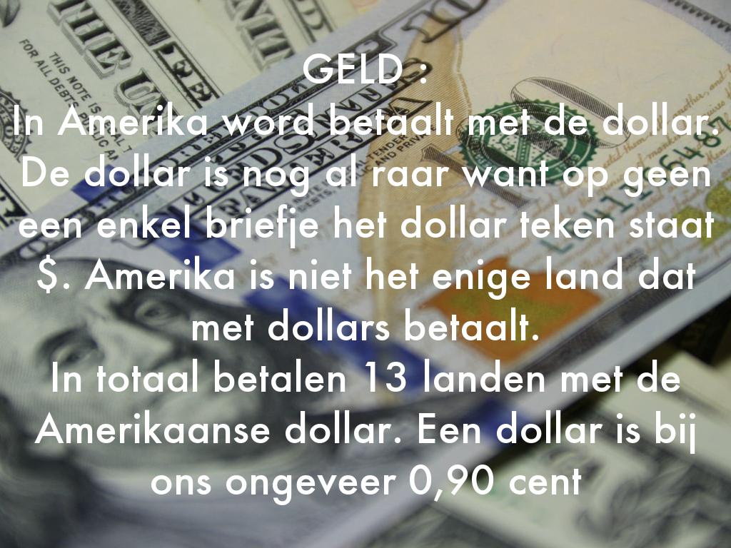 GELD : In Amerika word betaalt met de dollar. De dollar is nog al raar want op geen een enkel briefje het dollar teken staat $. Amerika is niet het enige land dat met dollars betaalt. In totaal betalen 13 landen met de Amerikaanse dollar. Een dollar is bij ons ongeveer 0,90 cent