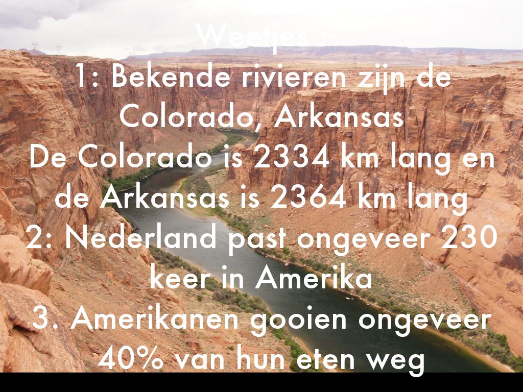 Weetjes : 1: Bekende rivieren zijn de Colorado, Arkansas De Colorado is 2334 km lang en de Arkansas is 2364 km lang 2: Nederland past ongeveer 230 keer in Amerika 3. Amerikanen gooien ongeveer 40% van hun eten weg