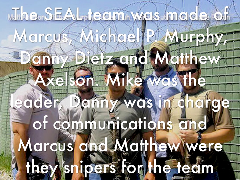 The SEAL team was made of Marcus, Michael P. Murphy, Danny Dietz and Matthew Axelson. Mike was the leader, Danny was in charge of communications and Marcus and Matthew were they snipers for the team