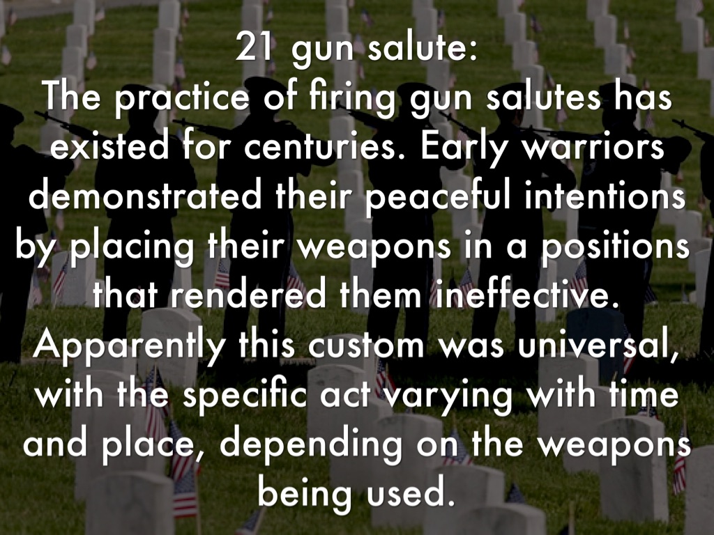 The practice of firing gun salutes has existed for centuries. Early warriors demonstrated their peaceful intentions by placing their weapons in a positions that rendered them ineffective. Apparently this custom was universal, with the specific act varying with time and place, depending on the weapons being used.