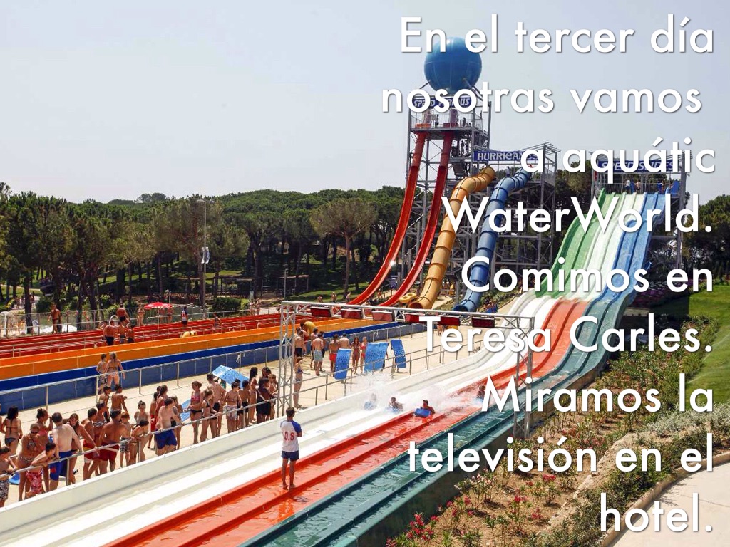 En el tercer día nosotras vamos a aquátic WaterWorld. Comimos en Teresa Carles. Miramos la televisión en el hotel.