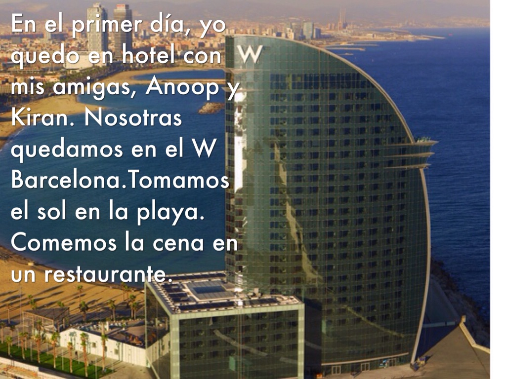 En el primer día, yo quedo en hotel con mis amigas, Anoop y Kiran. Nosotras quedamos en el W Barcelona.Tomamos el sol en la playa. Comemos la cena en un restaurante.