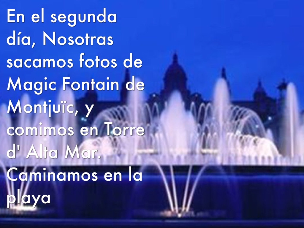 En el segunda día, Nosotras sacamos fotos de Magic Fontain de Montjuïc, y comimos en Torre d' Alta Mar. Caminamos en la playa