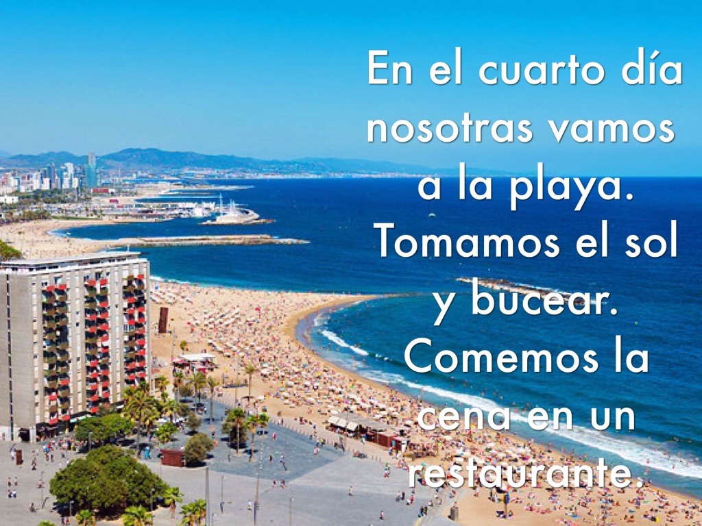 En el cuarto día nosotras vamos a la playa. Tomamos el sol y bucear. Comemos la cena en un restaurante.