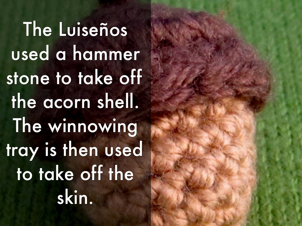 The Luiseños used a hammer stone to take off the acorn shell. The winnowing tray is then used to take off the skin.