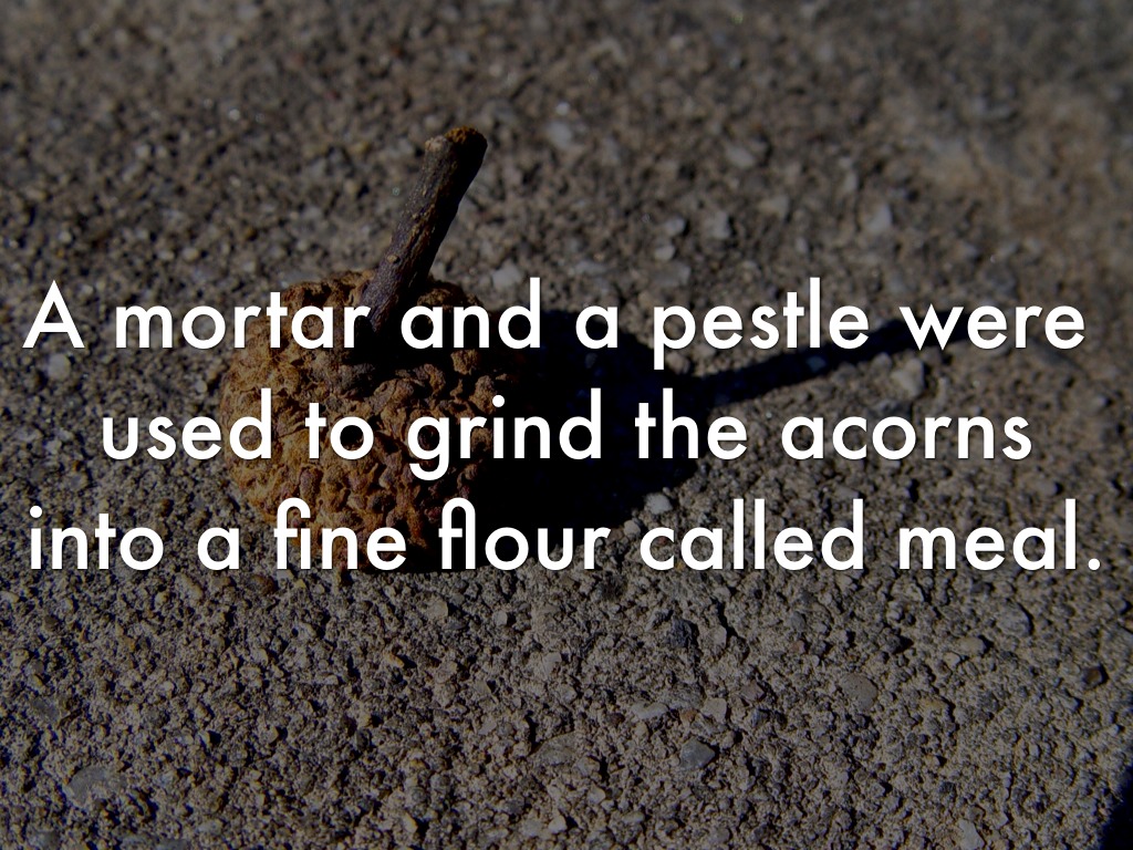 A mortar and a pestle were used to grind the acorns into a fine flour called meal.