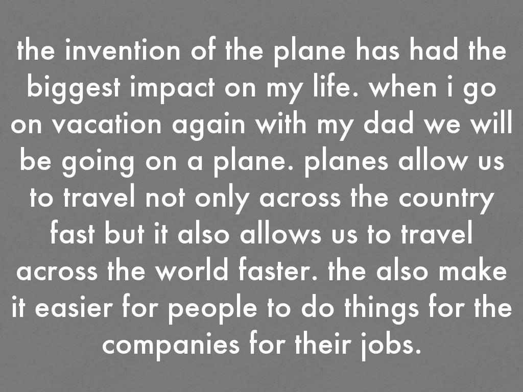 the invention of the plane has had the biggest impact on my life. when i go on vacation again with my dad we will be going on a plane. planes allow us to travel not only across the country fast but it also allows us to travel across the world faster. the also make it easier for people to do things for the companies for their jobs.
