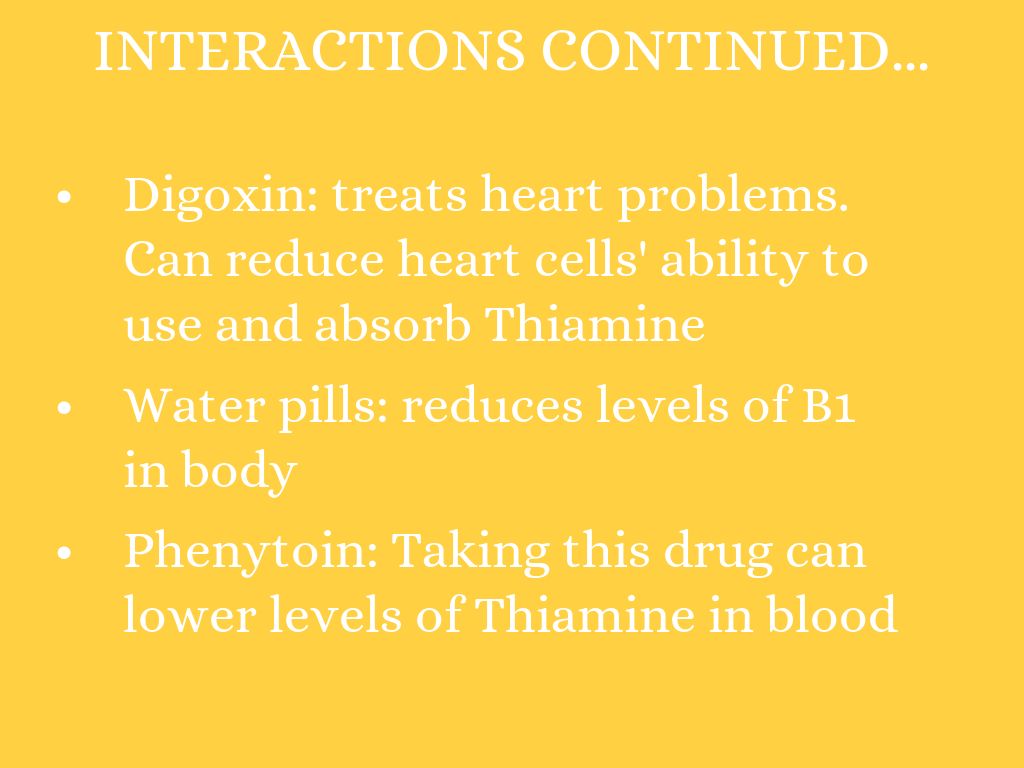 • Digoxin: treats heart problems. Can reduce heart cells' ability to use and absorb Thiamine