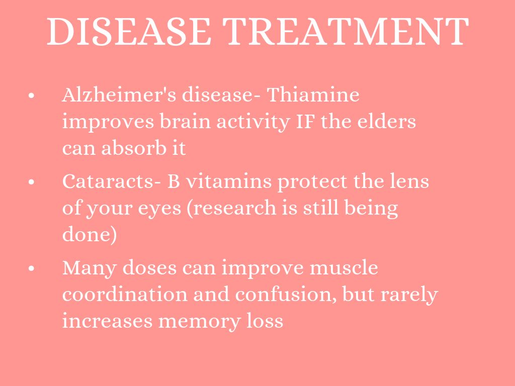 • Alzheimer's disease- Thiamine improves brain activity IF the elders can absorb it