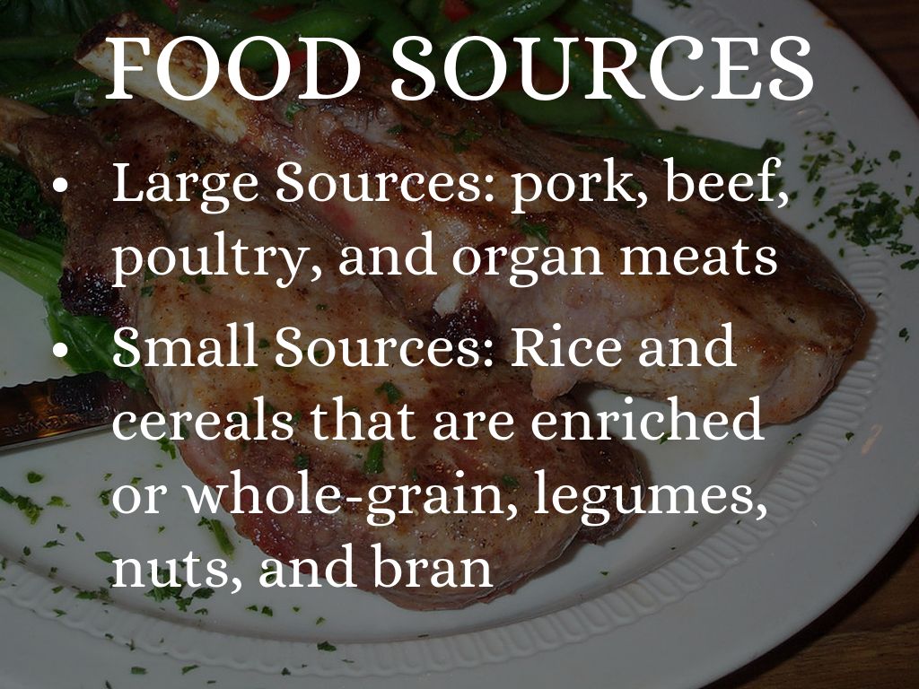 • Small Sources: Rice and cereals that are enriched or whole-grain, legumes, nuts, and bran