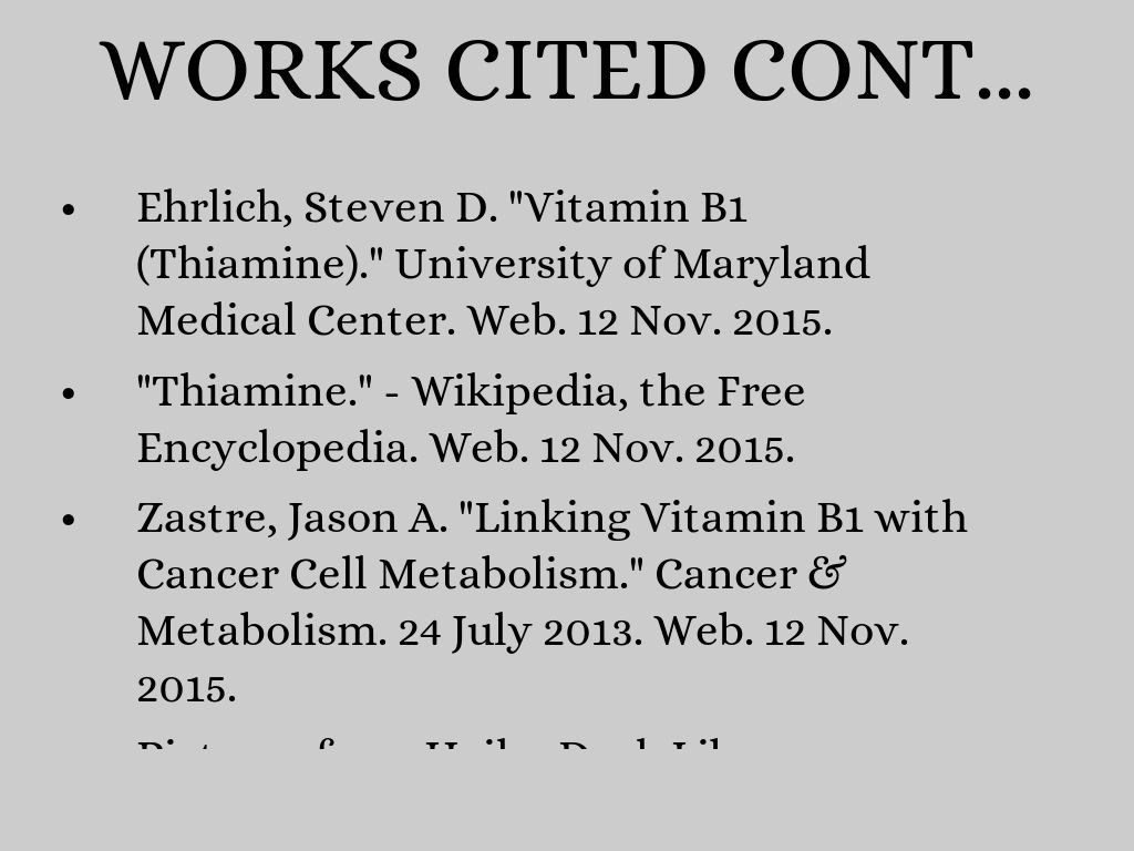 • Ehrlich, Steven D. "Vitamin B1 (Thiamine)." University of Maryland Medical Center. Web. 12 Nov. 2015.