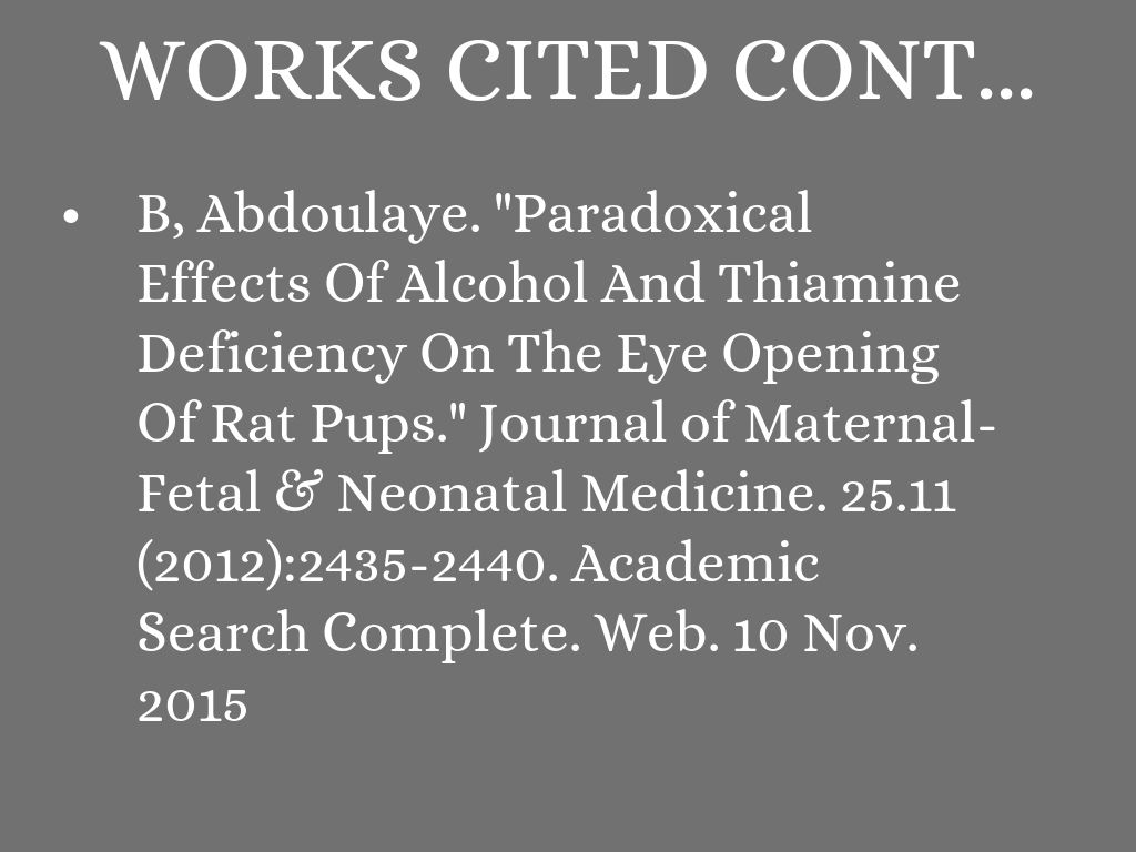 • B, Abdoulaye. "Paradoxical Effects Of Alcohol And Thiamine Deficiency On The Eye Opening Of Rat Pups." Journal of Maternal-Fetal & Neonatal Medicine. 25.11 (2012):2435-2440. Academic Search Complete. Web. 10 Nov. 2015
