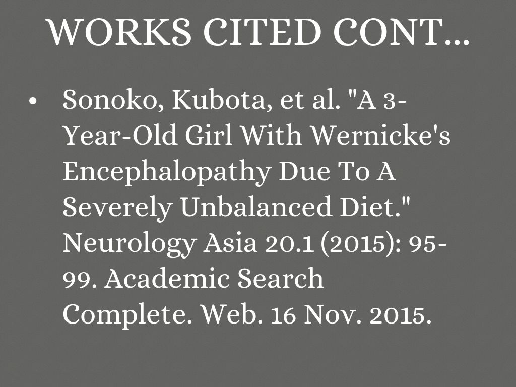 • Sonoko, Kubota, et al. "A 3-Year-Old Girl With Wernicke's Encephalopathy Due To A Severely Unbalanced Diet." Neurology Asia 20.1 (2015): 95-99. Academic Search Complete. Web. 16 Nov. 2015.