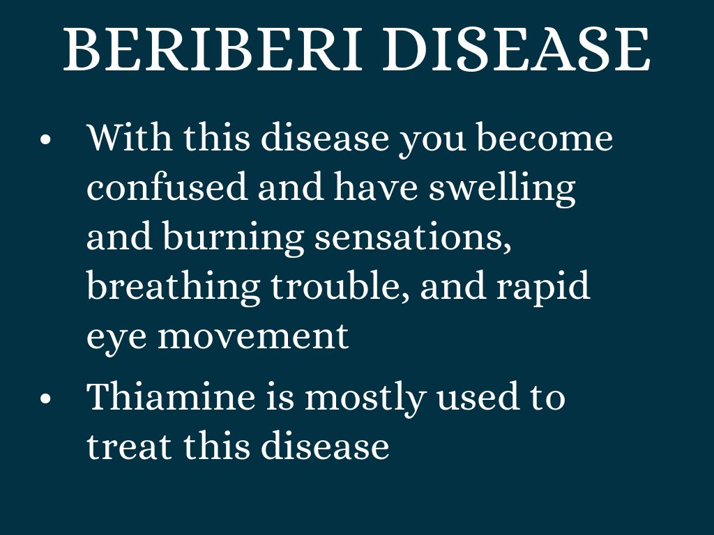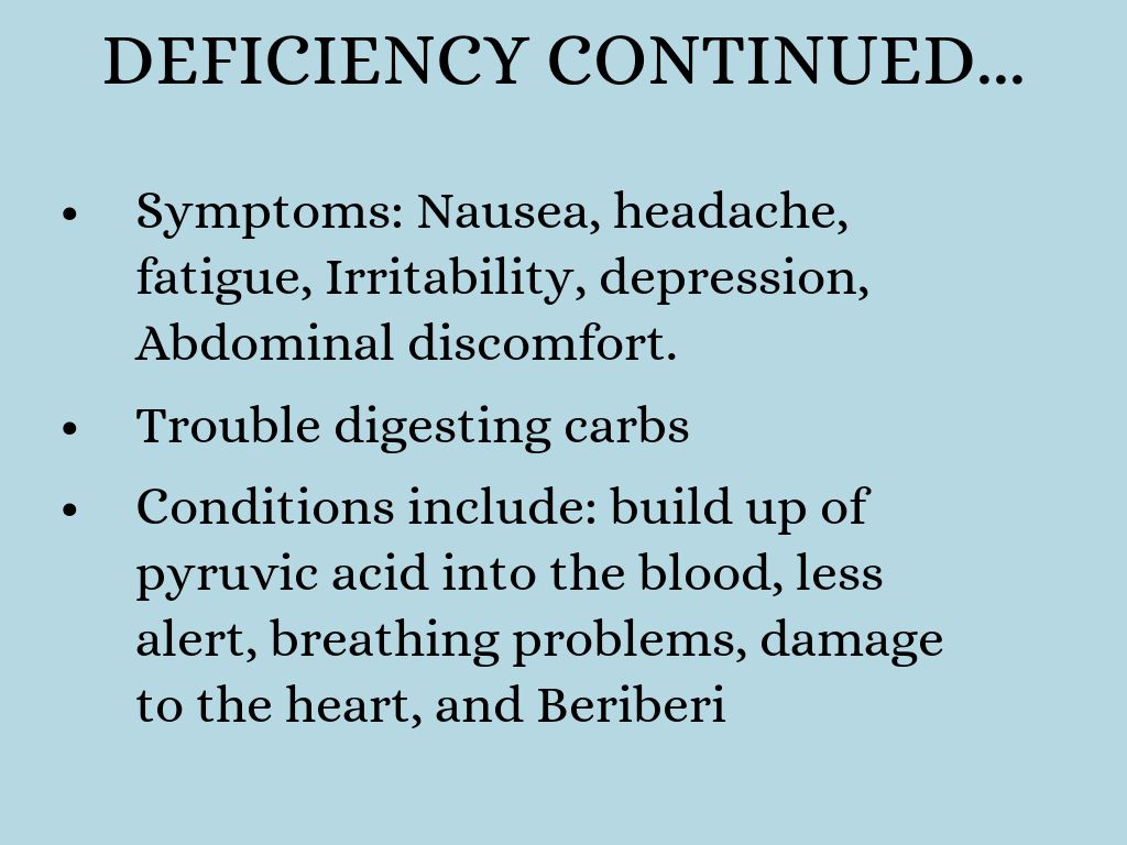 • Conditions include: build up of pyruvic acid into the blood, less alert, breathing problems, damage to the heart, and Beriberi