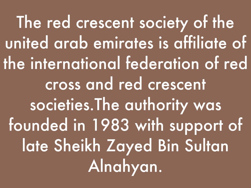 The red crescent society of the united arab emirates is affiliate of the international federation of red cross and red crescent societies.The authority was founded in 1983 with support of late Sheikh Zayed Bin Sultan Alnahyan.
